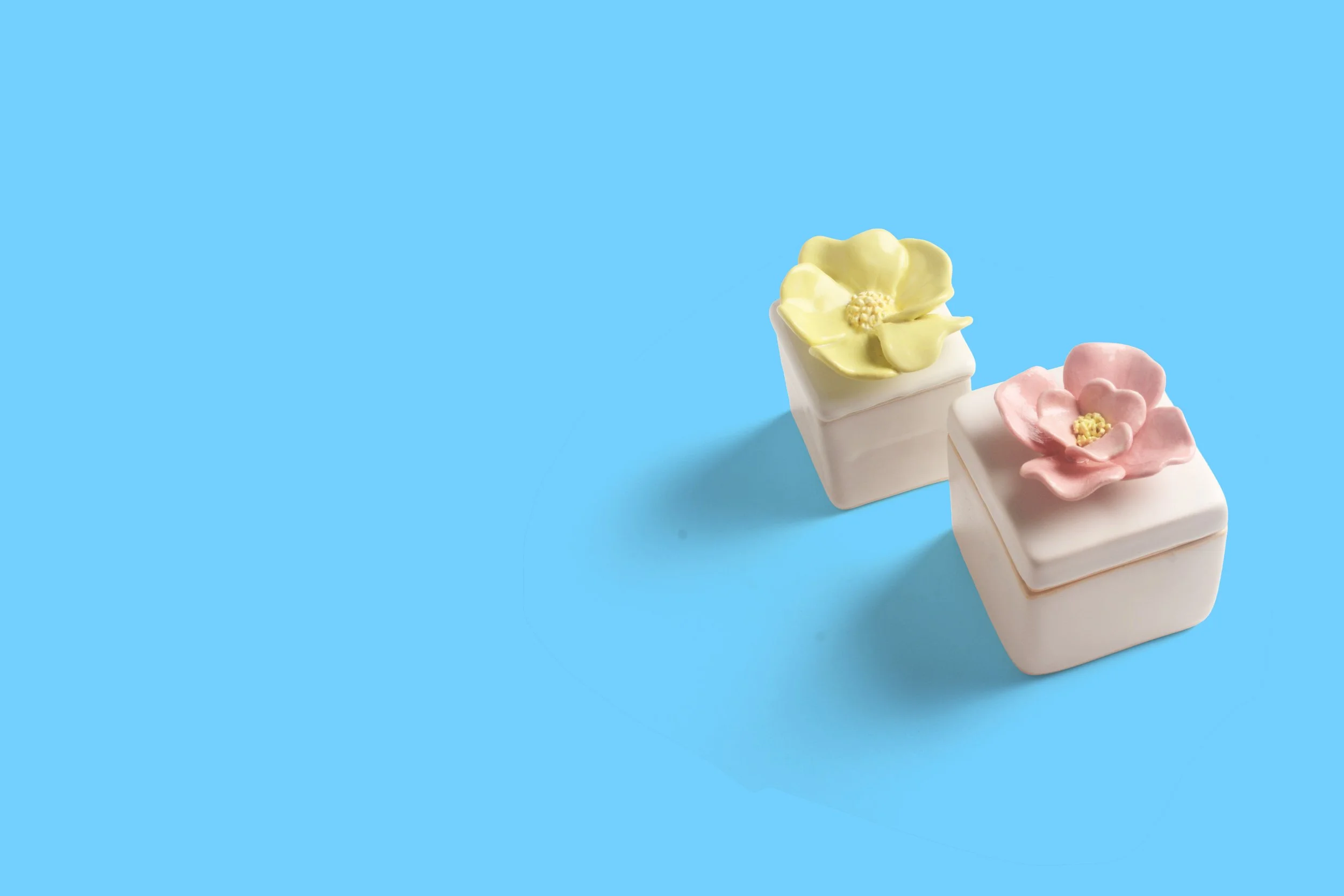 A white keepsake box topped with a hand-sculpted pink flower, perfect for rings, notes, or small keepsakes. Each bloom is shaped by hand, so no two are exactly alike.